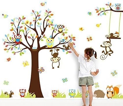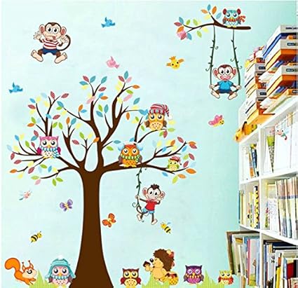 Grandora W5176 Adesivo Murale Albero Con Scimmie Su Un Altalena Gufi Amazon It Casa E Cucina