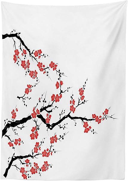 Albero Di Ciliegio Giapponese Decor Tovaglia Simplistic Asiatico Botanico A Tema Modello Fresh Organic Lines Art Lavoro Tavolo Rettangolare Copertura Per Sala Da Pranzo Kitchenes Rosso Nero Multy 72w X 90l Inches