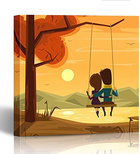 Emvency Pittura Stampa Su Tela Quadrato 40 6 X 40 6 Cm Coppia Two Lovers Seduto Su Altalena Al Tramonto Flat Cartoon Love Hug Day Cute Decorazione Artistica Da Parete Avvolto In Legno 20x20