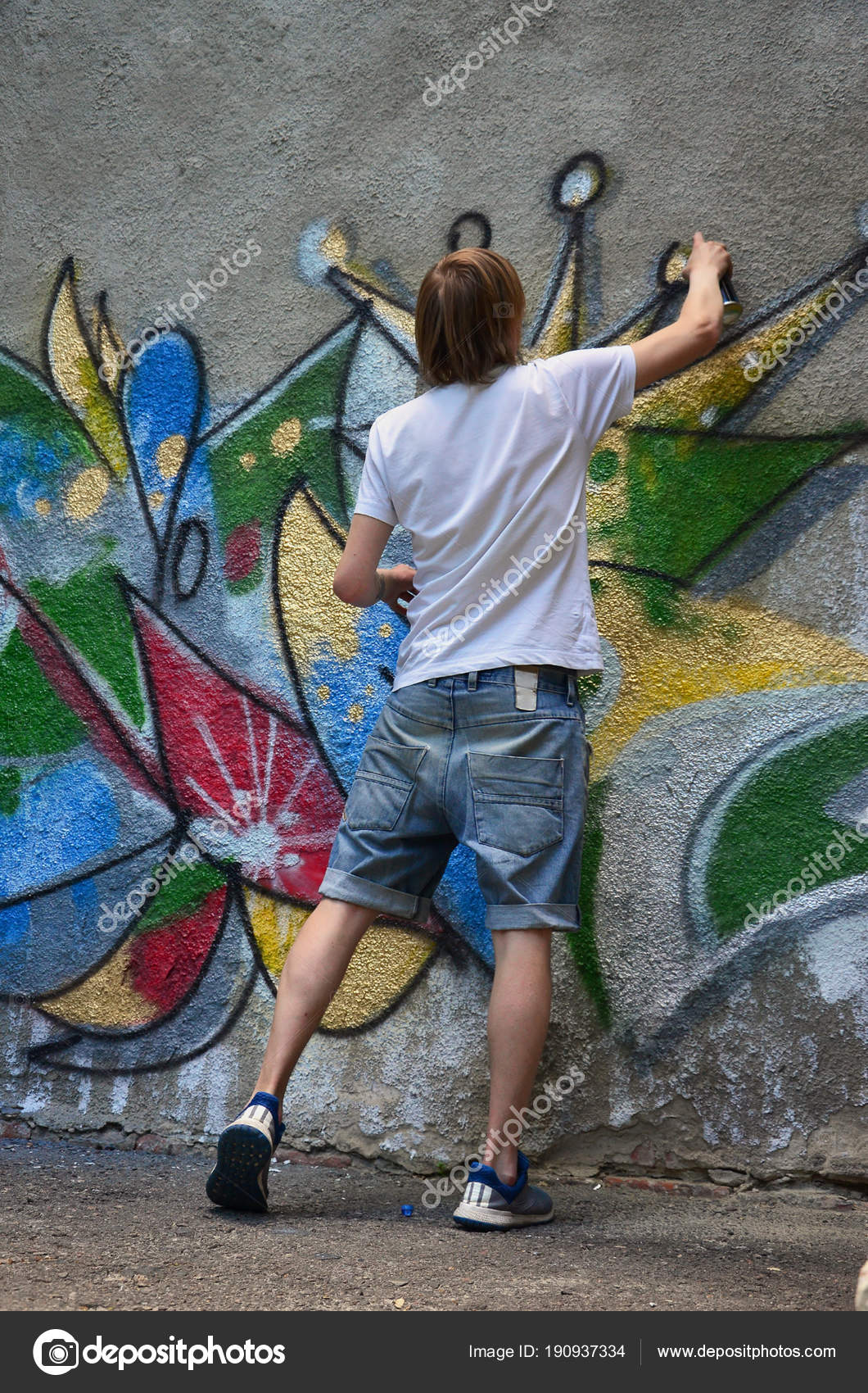 Photo Young Guy Denim Shorts White Shirt Guy Draws Graffiti Stock Photo C Mehaniq 190937334