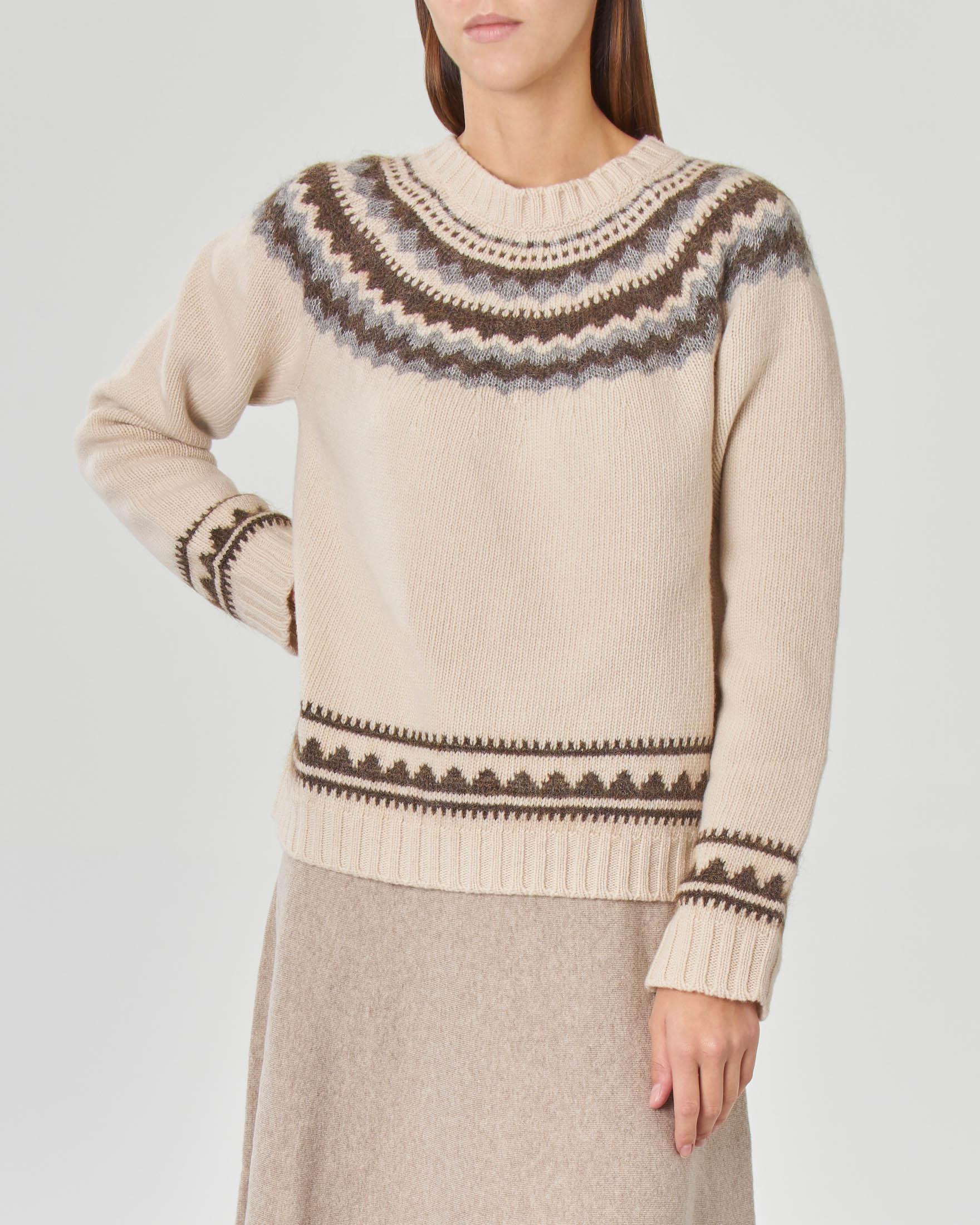 Maglia Beige In Lana Vergine Cardata Con Disegni Jacquard In Misto Mohair A Contrasto Di Colore Pellizzari E Commerce