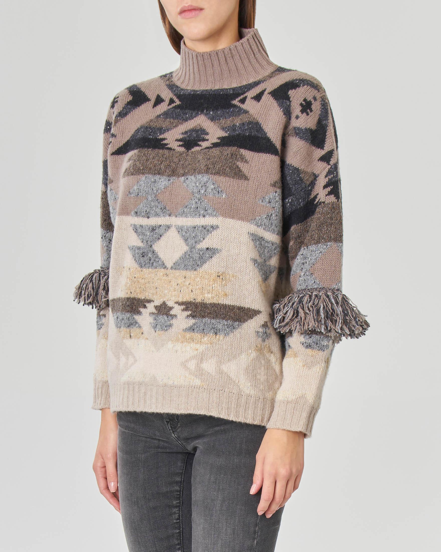 Maglia A Collo Alto In Lana Con Disegni Jacquard Stile Navaho E Frange Applicate Sulle Maniche Pellizzari E Commerce
