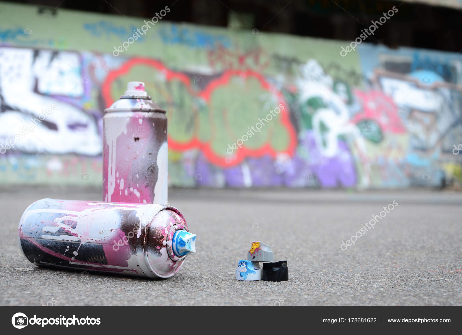 Diverse Bombolette Usate Con Vernice Rosa E Bianca E Tappi Per Spruzzare Vernice Sotto Pressione Si Trovano Sull Asfalto Vicino Al Muro Dipinto In Disegni Colorati Di Graffiti Foto Premium