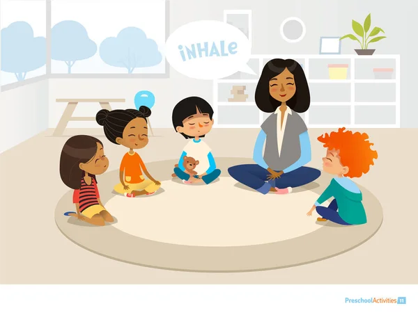 Un Insegnante Di Sesso Femminile Mostra Un Modello Della Terra Ai Bambini E Racconta Loro Di Bambini Dell Universo Seduti Al Suol Illustrazione Vettoriale Illustrazione Di Universo Gioco 198150713