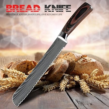 Ybqy Cucina Pane Coltello Seghettato Laser Di Disegno Di Damasco Lama In Acciaio Inox Da 8 Pollici Formaggio Chef Coltelli Pane Torta Taglierina Amazon It Casa E Cucina