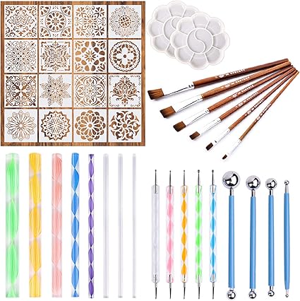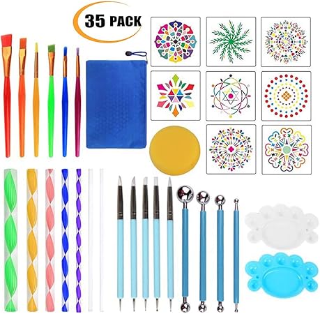 Hzw Set Di Strumenti Di Punteggiatura Di Mandala Di 35 Pezzi Kit Di Strumenti Di Pittura Stencil Mandala Aste Acriliche E Vassoio Di Vernice Per Rocce Pittura Disegni Da Colorare Disegno Amazon It
