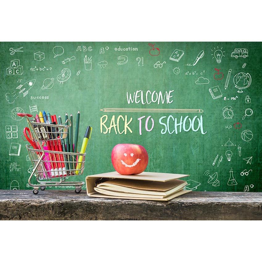 Acquista Di Nuovo Al Bordo Del Banco I Disegni Di Gesso Bianchi Del Bordo Di Insegnamento Di Verde Scuro Hanno Stampato Il Carrello Della Foto Del Bambino Dei Bambini Dei Bambini Del