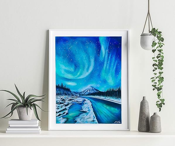 Disegno Aurora Boreale A Pastelli Su Carta Paesaggio Notturno Con Montagna Innevata Un Fiume E Alberi Amazon It Handmade