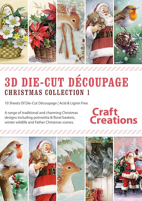 Craft Creations Fogli Fustellati Per Decoupage In 3d Collezione Natalizia Pk764 Fogli Formato A4 10 Disegni Assortiti Con Babbo Natale Animali Selvatici In Inverno E Stelle Di Natale