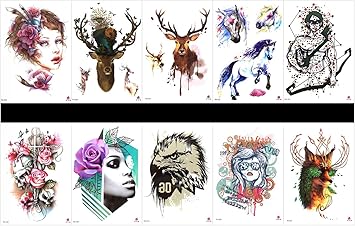 Interookie 10pcs Finto Tatuaggio Adesivi Tatuaggi Temporanei Cervo In Un Imballaggio Disegni Misti Come Guerriero Teschio Con Fiori Bella Girds Cervo Cavallo Gufo Lupo Ecc Amazon It Bellezza