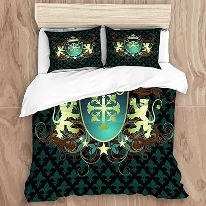 Adoninelp Set Biancheria Da Letto Set Copripiumino In Microfibra Con Federa Disegno Araldico Dello Stemma Del Medioevo Corona Di Leoni E Volute 1 Copripiumino 140 X 200cm 2 Federe 50 X 80 Cm Amazon It