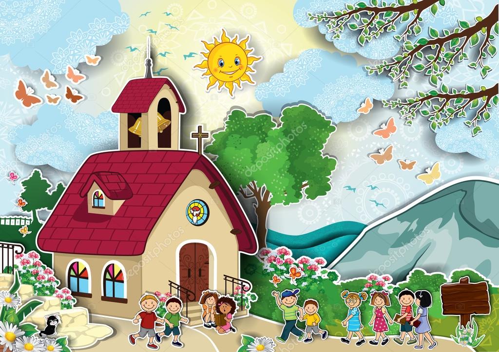 Bambini Chiesa Direzione Bambini Illustrazione Verso Chiesa Intestazione Canstock