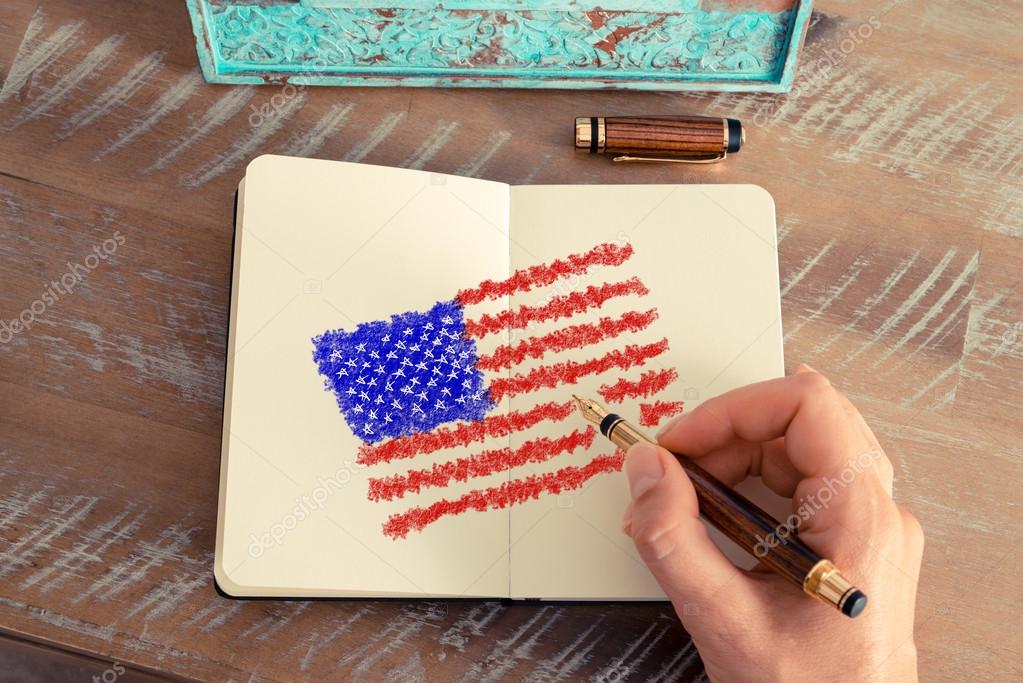 Donna Mano Disegno La Bandiera Americana Su Notebook Foto Stock C Stanciuc1 95763714