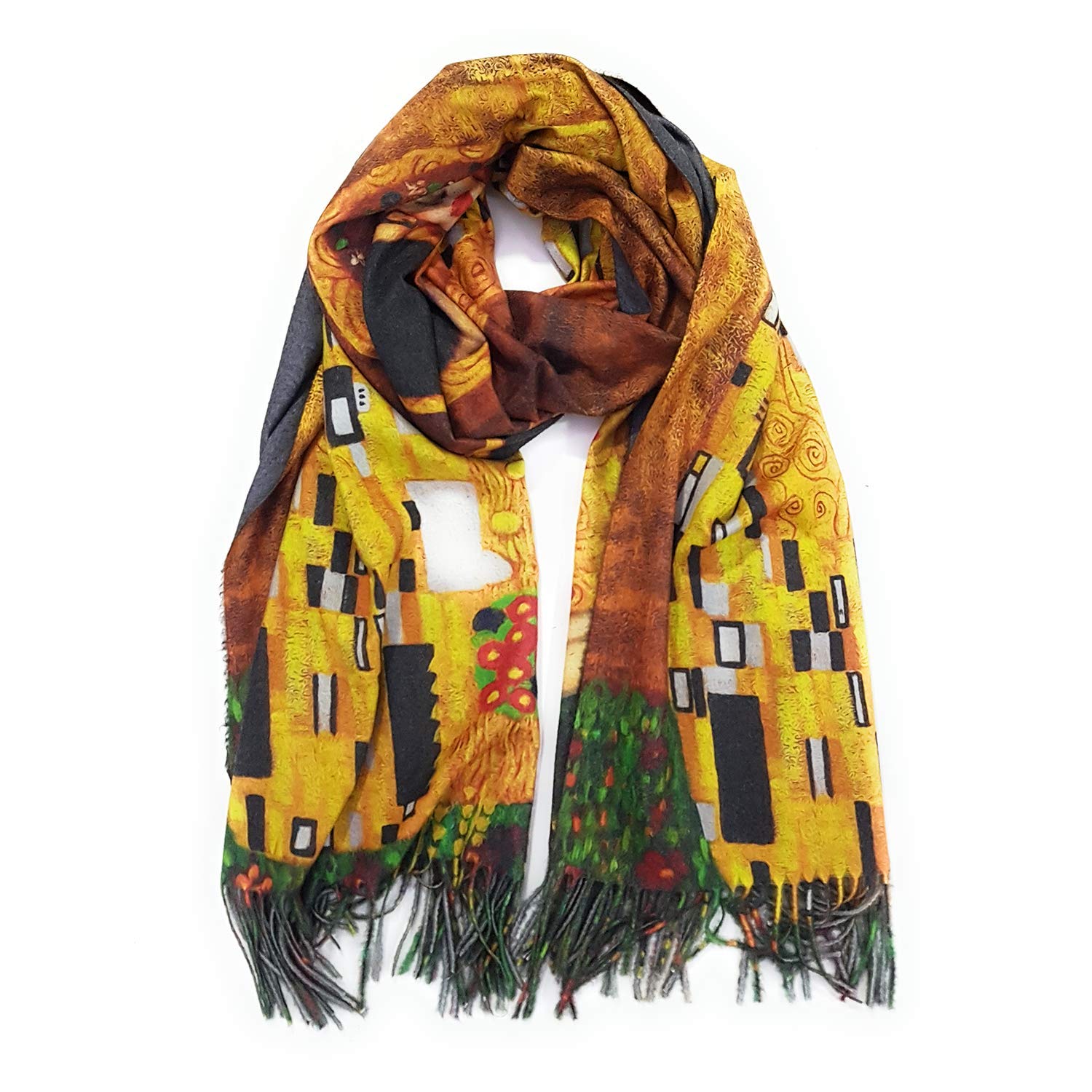 Disegno Il Bacio Di Klimt Cindystylist Sciarpa Lana E Viscosa Dimensioni 180x74 Cm Multicolore Colore Interno Grigio Stola Sfrangiata Sciarpe E Stole Donna