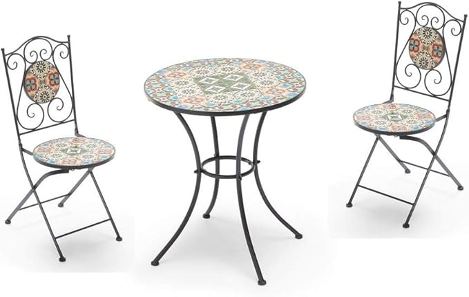 Set Bistrot Mosaico Per Giardino Tavolo 60 Cm Con Due Sedie Pieghevoli Con Cuscino