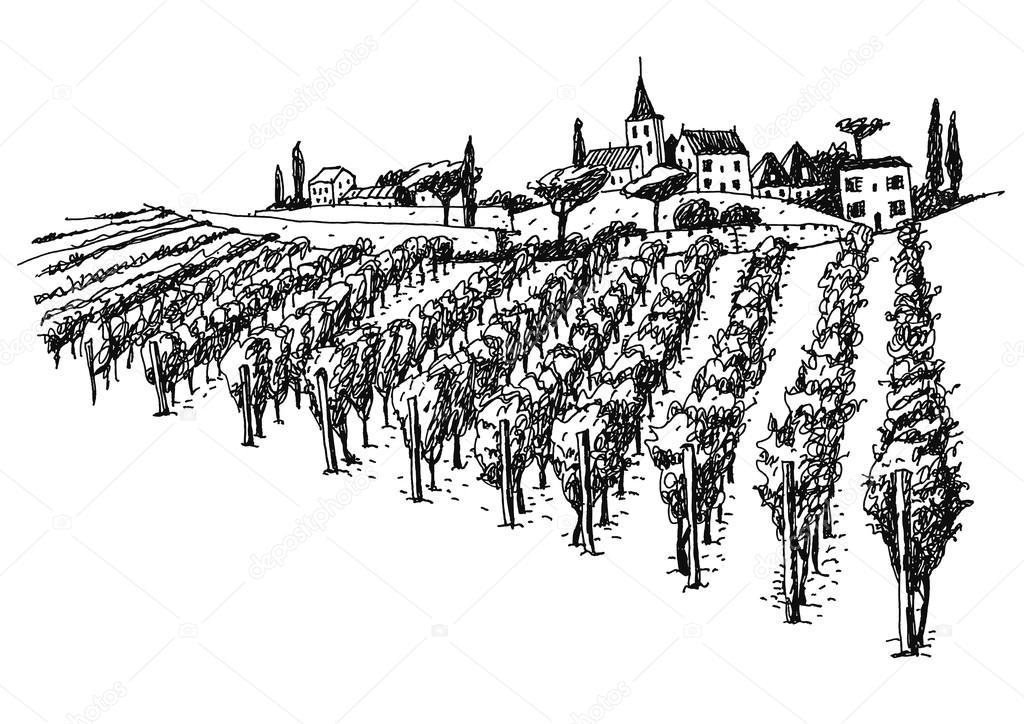 Disegno Del Vigneto Con Uve Il Percorso E Le Case Sulla Collina Disegnate A Mano Illustrazione Vettoriale Immagine E Vettoriale Alamy