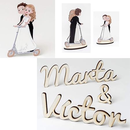 Momparler1870 Set Speciale Per Matrimoni Divertente Statuetta Sposi Per Torta Monopattino In Legno E Originale Decorazione In Legno Con I Nomi Degli Sposi Amazon It Casa E Cucina