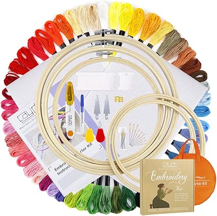 Amazon Com Caydo Full Range Of Embroidery Starter Kit Including Instructions 5 Pieces Bamboo Embroidery Hoops 50 Color Threads 2 Pieces Aida Cloth Circular Packing Bag And Cross Stitch Tool Kit For Beginners