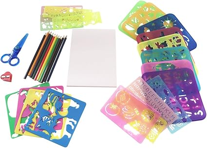 Jumbo Set Di Stencil 34 Pezzi Include 20 Mascherine Forbici Per Bricolage Blocco 10 Matite Colorate Include Pratica Borsa Per Il Trasporto Set Stencil Per Disegnare E Colorare Amazon It