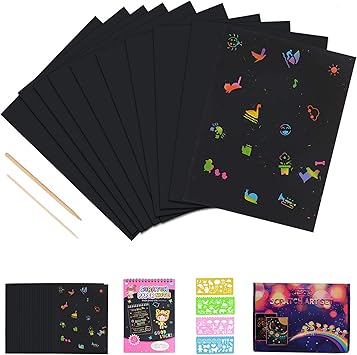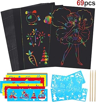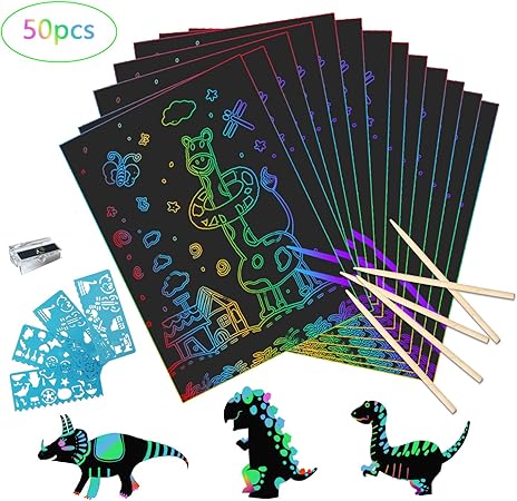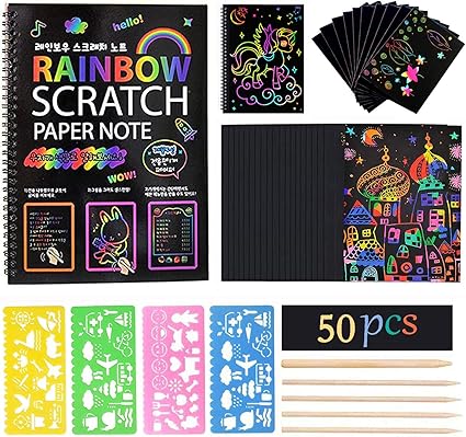 Fogli Di Disegni Scratch Art Jbson 50 Fogli Arcobaleno Da Grattare Set Artistico Colorato Da Scarabocchiare Con 4 Modelli Di Disegno Su Righelli Forati Con Stampe E 5 Puntine In Legno Per Disegnare Amazon It