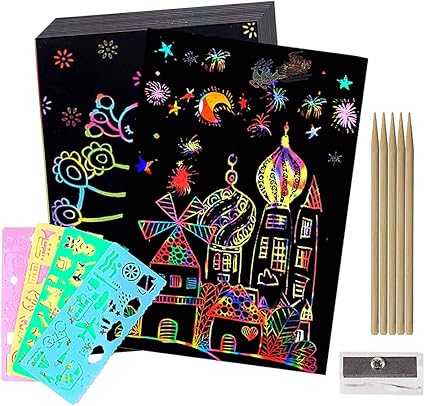 Fogli Di Disegni Scratch Art 50 Fogli Arcobaleno Da Grattare Set Artistico Con 4 Modelli Di Disegno Su Righelli Forati Con Stampe 5 Puntine In Legno Per Disegnare Amazon It Casa E Cucina