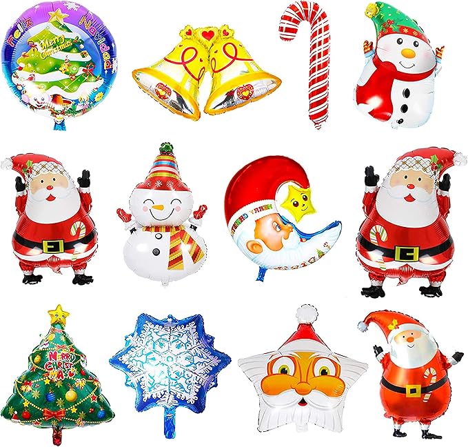 Palloncini In Foil A Tema Natalizio 12 Disegni Assortiti Albero Di Natale Stella Babbo Natale Pupazzo Di Neve Fiocco Di Neve E Campana Ideali Per Feste Di Compleanno Per Bambini