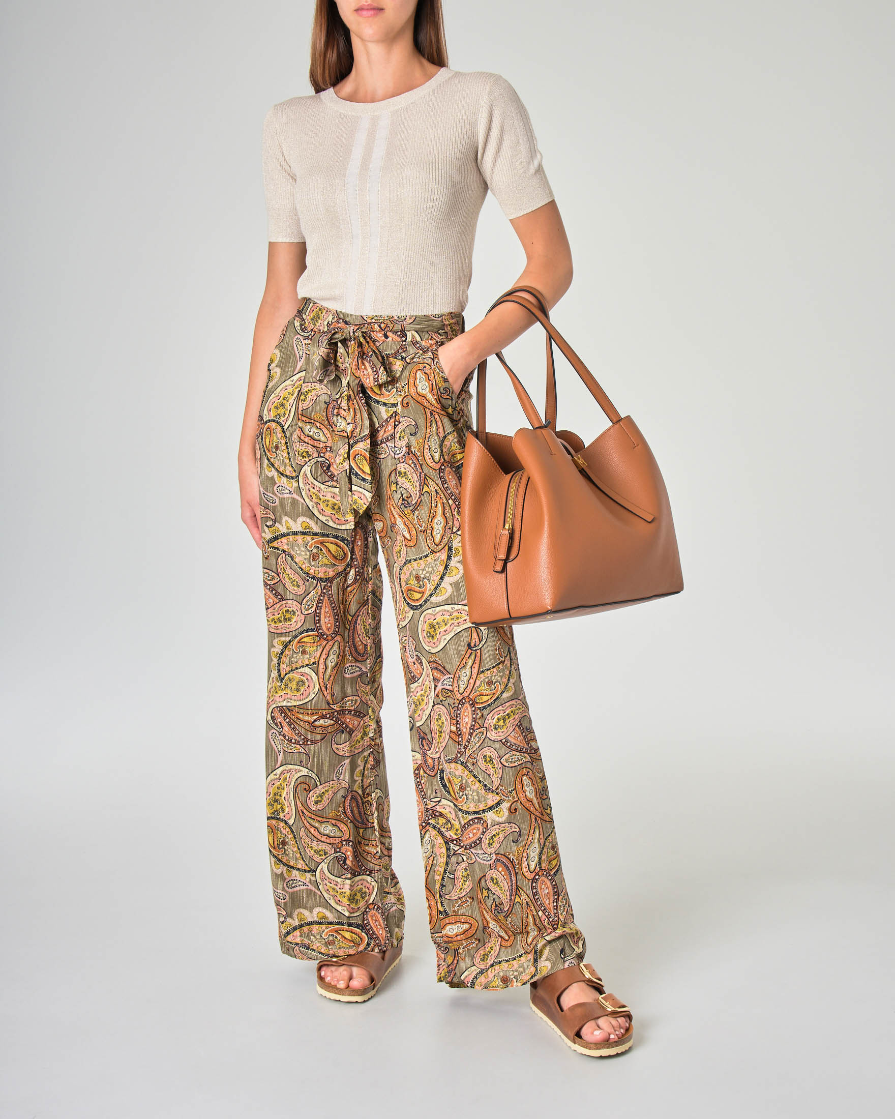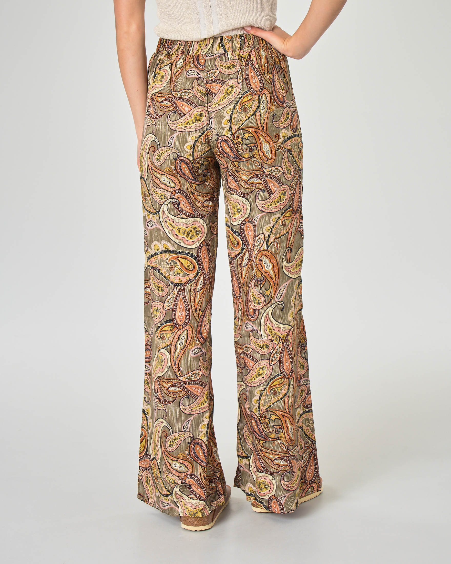 Pantaloni Palazzo In Viscosa Verde Militare Con Disegni Cachmere Ed Elastico E Cintura In Vita Pellizzari E Commerce