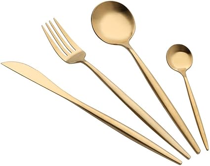 Cvthfyky 304 Acciaio Inossidabile Posate Cucchiaio Disegno Stile Spessore Titanio Coltelli Da Bistecca E Forchette Montati Famiglia Di Quattro Colore Oro Amazon It Casa E Cucina
