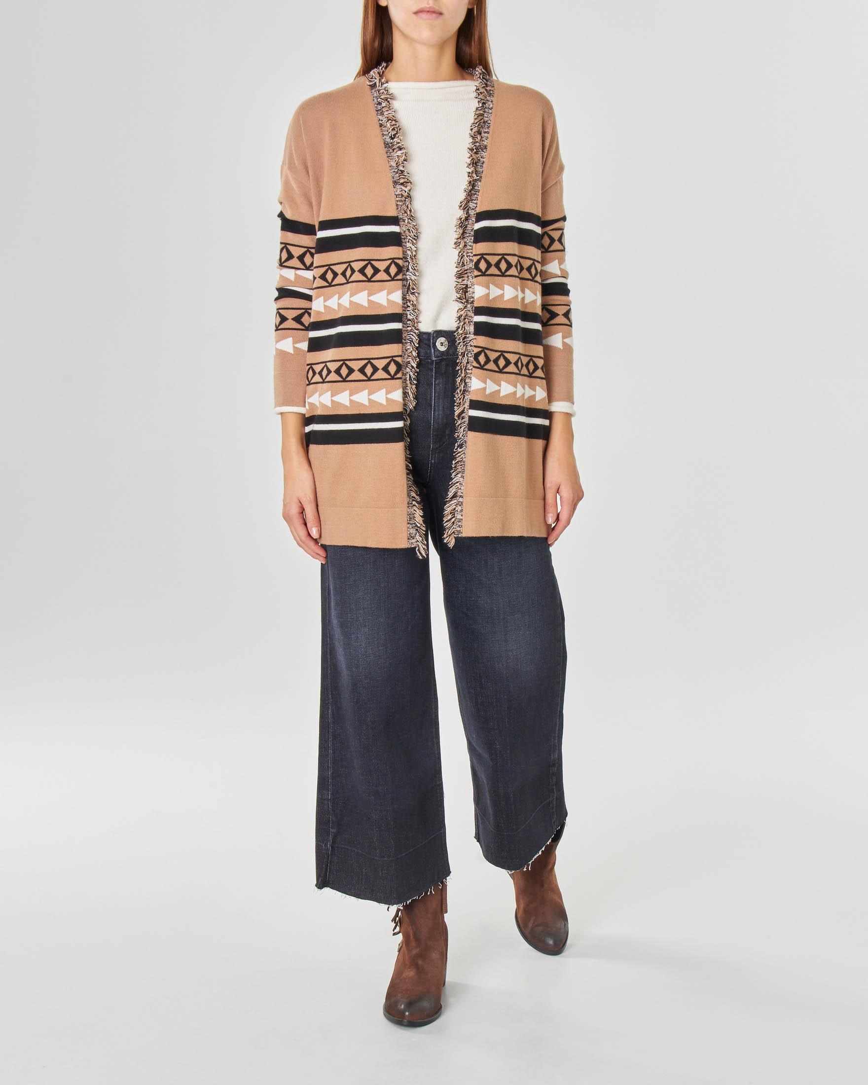 Cardigan In Misto Viscosa Su Base Beige Con Disegni Jacquard Stile Navaho Profili Con Frange Pellizzari E Commerce