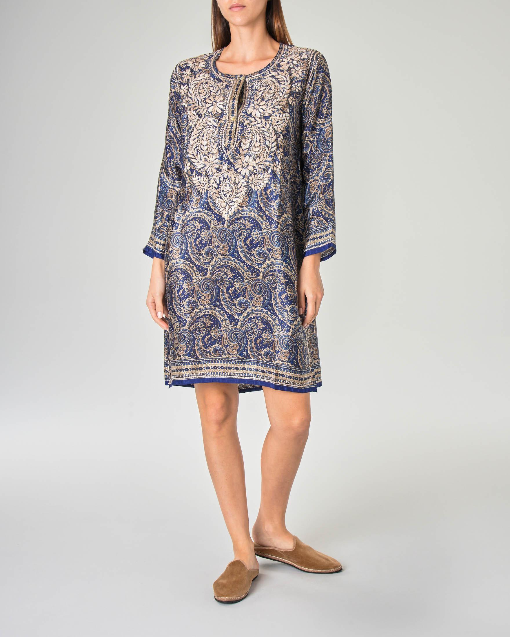 Tunica Corta In Seta Blu A Disegni Cachmere Beige E Ricami Fatti A Mano Pellizzari E Commerce