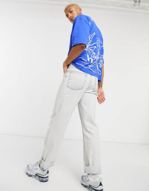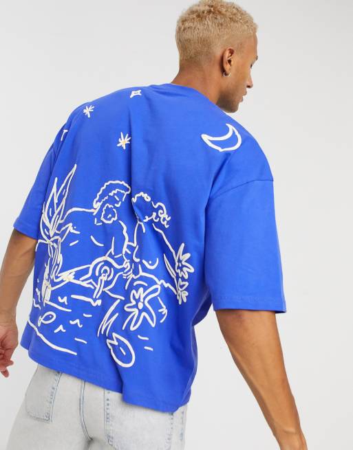 Asos Design T Shirt Oversize Blu Con Ricami A Linee Disegnate Su Petto E Retro Asos