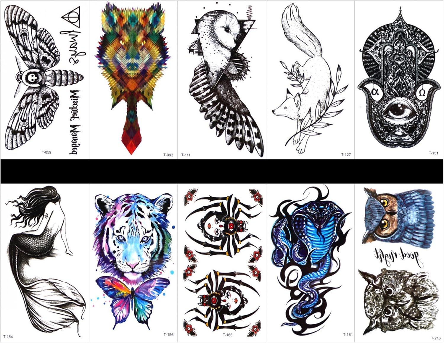 Interookie 10pcs Fake Tattoo Stickers Spider Tatuaggi Temporanei In One Colli Disegni Misti Come Tiger Farfalla Ragno Libellula Totem Bird Lupo Sirena Cobra Gufo Ecc Amazon It Bellezza