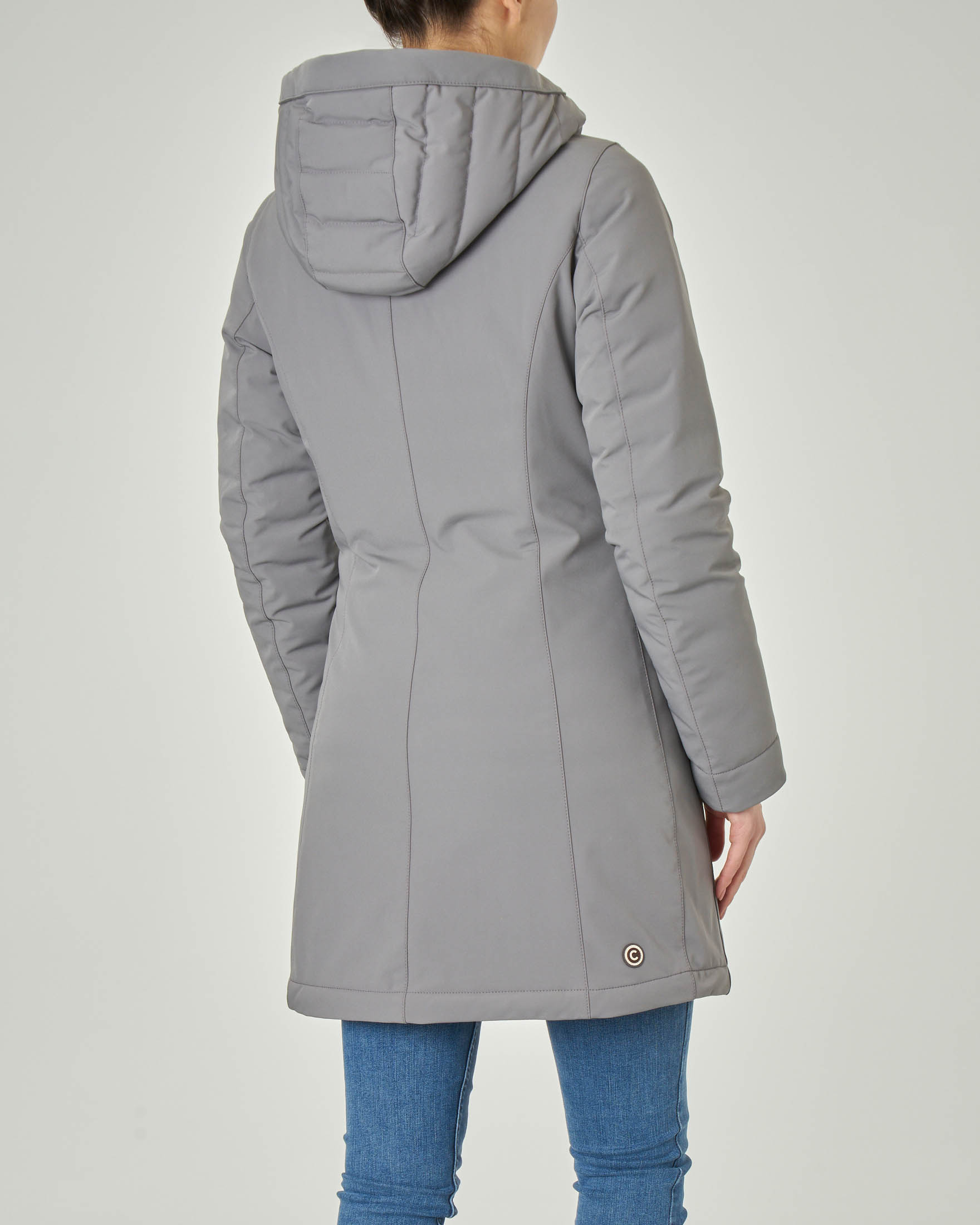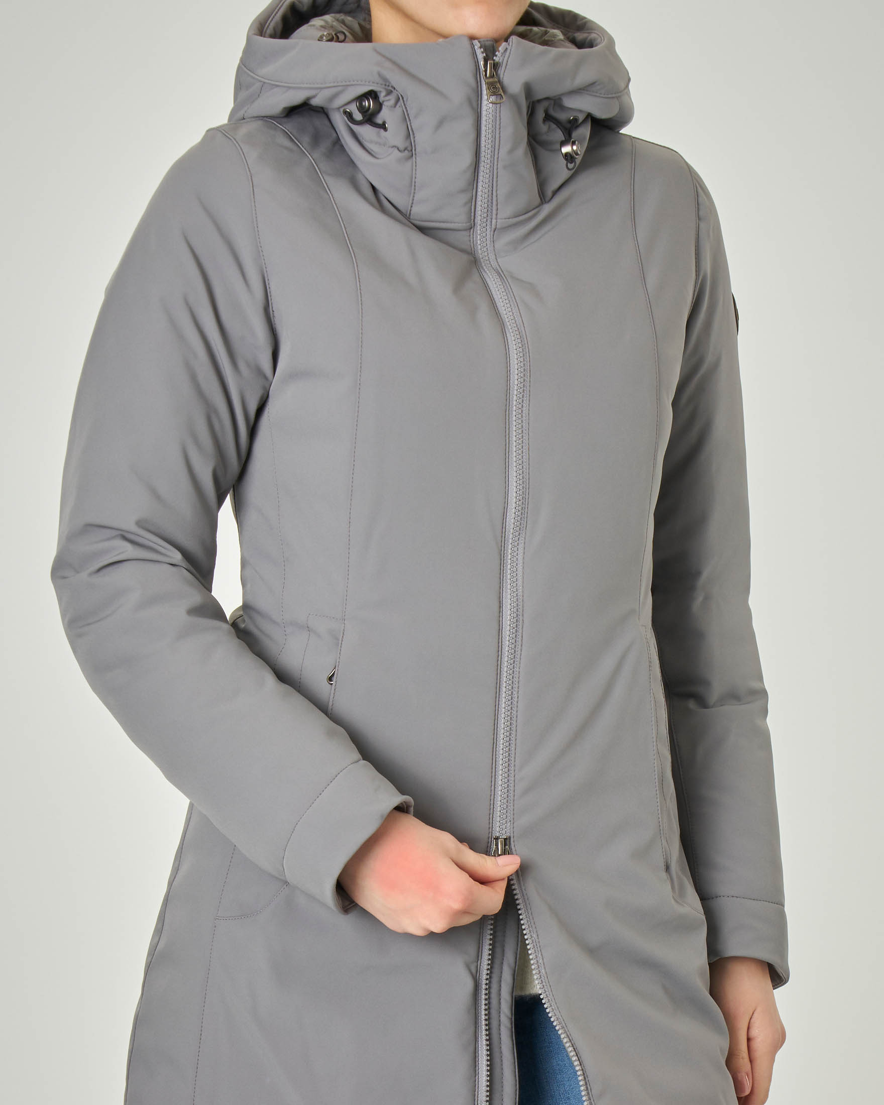 Giacca Grigia Lunga In Tessuto Tecnico Opaco Liscio Con Collo Alto E Cappuccio Pellizzari E Commerce